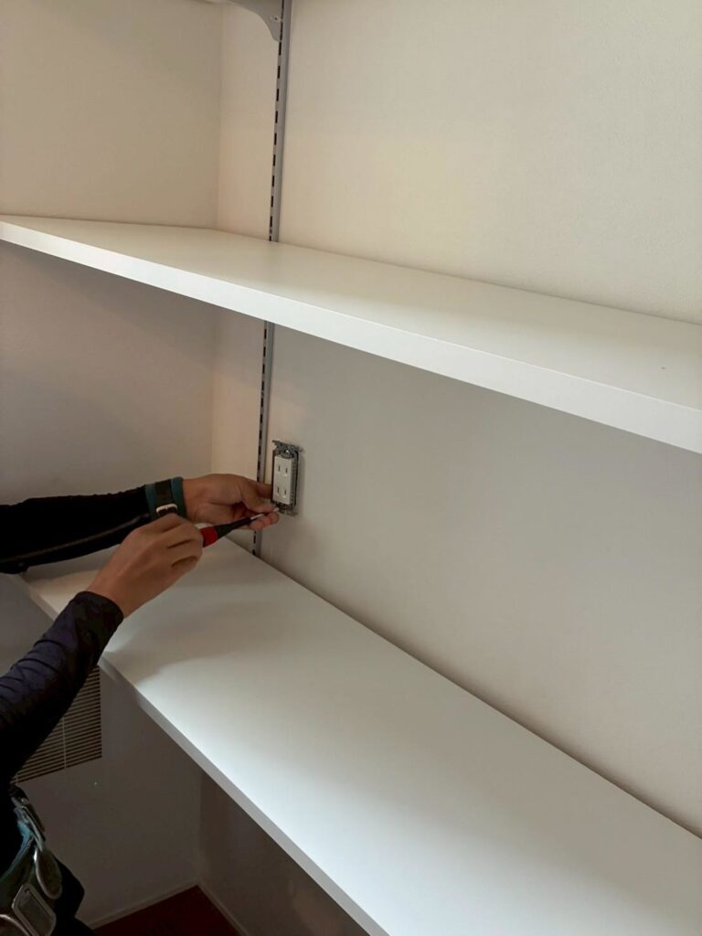 コンセントの設置個所に穴をあけて電気の線を通し、コンセントを取り付けます。